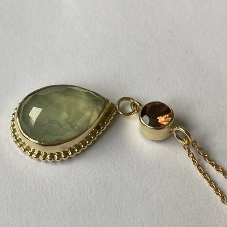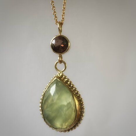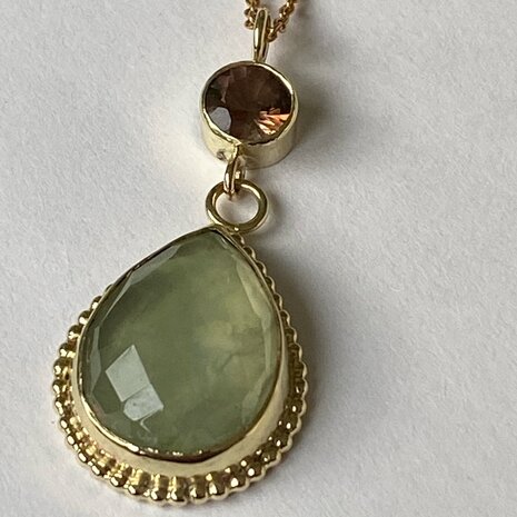 14 Karaat geelgouden hanger van roosgeslepen prehniet en facet geslepen andalusiet. De achterwand van de prehnietkast is van zilver, de zetranden en parelrand is van 14 karaat geelgoud. Prehniet heeft een zacht groen gele kleur. Andalusiet werd voor het eerst gevonden in Andalusie. Tegenwoordig wordt de steen vooral gevonden in Brazilie of Duitsland. prehniet: roosgeslepen 20x15 mm andalusiet: facet geslepen 7 mm totale lengte hanger : 4,3 cm